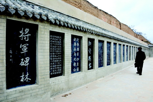 中岔古堡一堡三院,分為前院、中院、后院。走進(jìn)古堡,堡門左側(cè)建有戲樓,上書“中岔劇場(chǎng)”四字。戲樓(又稱戲臺(tái))始建于清光緒年間,上世紀(jì)六七十年代曾重修過(guò)。近堡門處右側(cè)堡墻下修建有兩處一體化的石碑長(zhǎng)廊一直通向后院,碑廊中石碑一塊接著一塊砌筑在青磚墻內(nèi),石碑與石碑之間以青磚分隔,上覆筒瓦和滴水防護(hù),每一通石碑上都刻有中華人民共和國(guó)將軍書寫的一幅書法作品。第一通石碑上甘谷籍將軍張臣剛書寫的“將軍碑林”四字分外醒目,劉精松、邢世忠、裴懷亮、李乾元等數(shù)十位叱咤風(fēng)云的共和國(guó)將軍書寫的書法碑刻依次嵌進(jìn)墻內(nèi),組成一個(gè)氣勢(shì)磅礴、雄偉壯觀的將軍書法長(zhǎng)廊,這就是新建的將軍碑林。