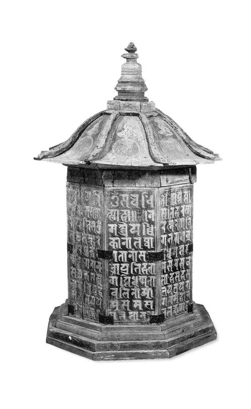 西夏木緣塔為西夏墓葬中第一次發(fā)現(xiàn)的西夏葬器。該塔通高75厘米,塔頂邊沿寬47厘米,呈四層八角形,飾紅色;分塔座、塔身、塔頂和塔剎四部分。塔座為四級八邊臺階。塔身為八邊柱體形,由長34厘米、寬12.5厘米、厚2厘米的八塊木板合成,表面涂藍(lán)色,每邊有黃色工整梵文“陀羅尼”,并用漢文注明陀羅尼經(jīng)名。塔頂為傘式八邊形,每邊彩繪云氣紋和一個梵文字,內(nèi)有墨書“故考任西經(jīng)略司都案劉德仁,壽六旬有八,于天慶五年歲次戊午四月十六日亡歿,至天慶七年歲次庚辰(申)口夏十五日建緣塔,至中秋十三日入課訖”。塔剎圍欄為八邊形,其他相輪、覆缽、剎頂都是圓形,由下向上收分;底座周圍繪有卷草紋。