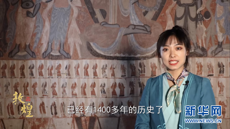 “‘敦煌仿妝’好了,我們一起去看看壁畫(huà)原作吧!”鏡頭一轉(zhuǎn),班銳從美妝博主成了穿著工作服的講解員。