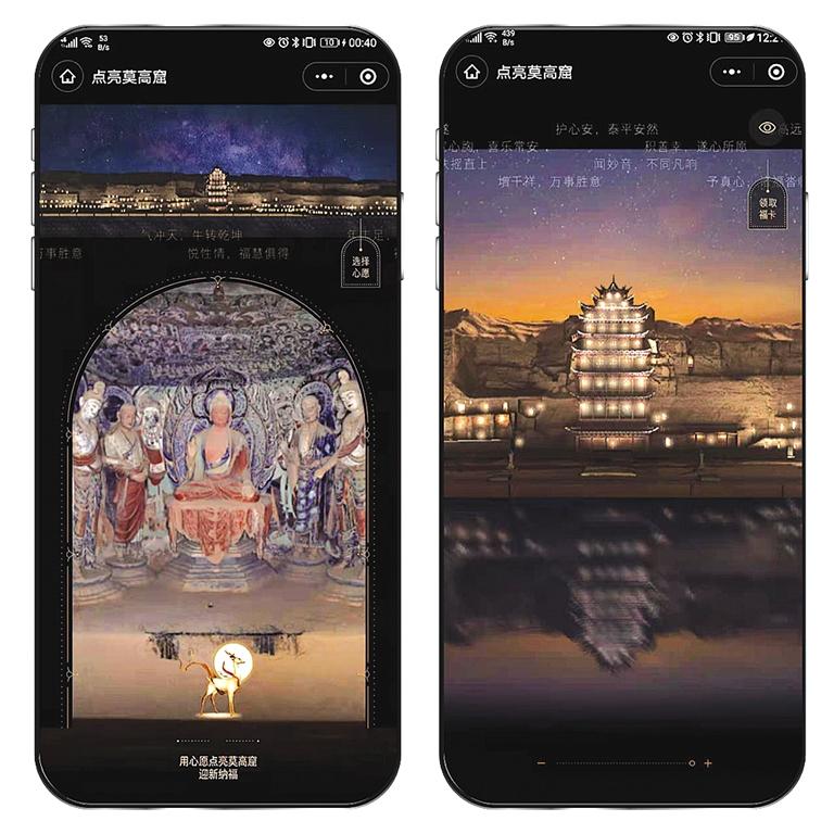 為了感受千年前莫高窟的燃燈民俗,記者迫不及待地體驗(yàn)了一把:進(jìn)入“云游敦煌”官方小程序,通過“點(diǎn)亮莫高窟”入口,即可欣賞星空下的莫高窟全景,并與萬千用戶一起“點(diǎn)亮”崖體上的洞窟。隨著用戶點(diǎn)亮人次增多,畫面中燈光的亮度也隨之增加。至深夜時(shí)分,用戶將會看到莫高窟崖體上空“銀河”與洞窟光亮相映成輝的景象,體驗(yàn)千年前莫高窟燃燈盛況。“點(diǎn)亮莫高窟”的創(chuàng)意來自于敦煌文獻(xiàn)中記載的場景,莫高窟燃燈是敦煌歲時(shí)民俗。據(jù)記載,每逢特定的時(shí)間,當(dāng)?shù)孛癖姇谀呖吲e行盛大的燃燈活動,于窟龕點(diǎn)亮燈盞??偀魯?shù)可高達(dá)700余盞。
