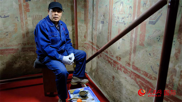 敦煌研究院文物保護(hù)修復(fù)工作者劉濤在工作現(xiàn)場。人民網(wǎng) 呂強(qiáng)攝