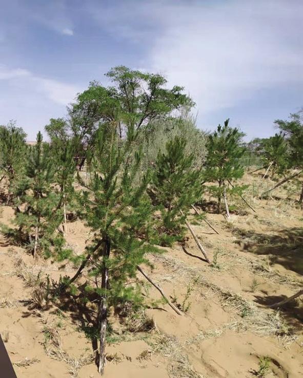 我和同伴撲進沙海柔軟的懷抱。認識到,再小的沙粒,也不能與塵世隔絕,我與沙,結緣于此。沙海里,一沙一世界。黃沙大膽赤裸地暴露在天幕蒼芎下,以大,以小,涵納無窮。“沙沙”的足音里,印下我深深淺淺兩行腳印,宣告著浪漫與踏實的存在。我來到習近平總書記親手栽植的“五棵松”下,仰視青松,綠云葳蕤,生機勃勃??倳浀年P懷和鼓勵,黃沙熱熱地、輕輕地長出了更多綠色羽翼,這羽翼在不斷地生長壯大,有“代代相傳”的精神,綠色終究會覆蓋全部騰格里。捧起一捧黃沙,細沙像嬰兒肌膚般的柔滑,我試圖用臉貼近它,這些黃色的小精靈,從我指縫間輕盈地流淌到松下,似乎在暗示我,要把自己的夢筑進治沙精神的瀚海里??茖W家們已作出結論:沙漠是人類最后的寶地,別看它現(xiàn)在荒蕪,它里面蘊藏著無盡的寶藏和財富。