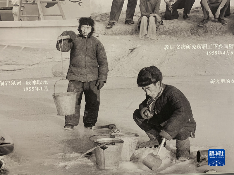 展覽的第二部分,主要呈現(xiàn)1944年“國立敦煌藝術(shù)研究所”成立后,幾代文化工作者扎根大漠、開拓進(jìn)取的歷程。該部分展出了大量老照片,如上世紀(jì)五六十年代,文化工作者破冰取水、耕作勞動的場景。