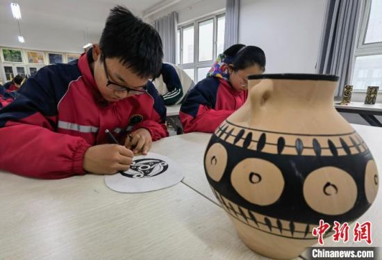 近日,中新社中新網(wǎng)記者走進蘭州市第三中學“彩陶”課堂,學生正在繪制彩陶圖案?!⒂裉摇z