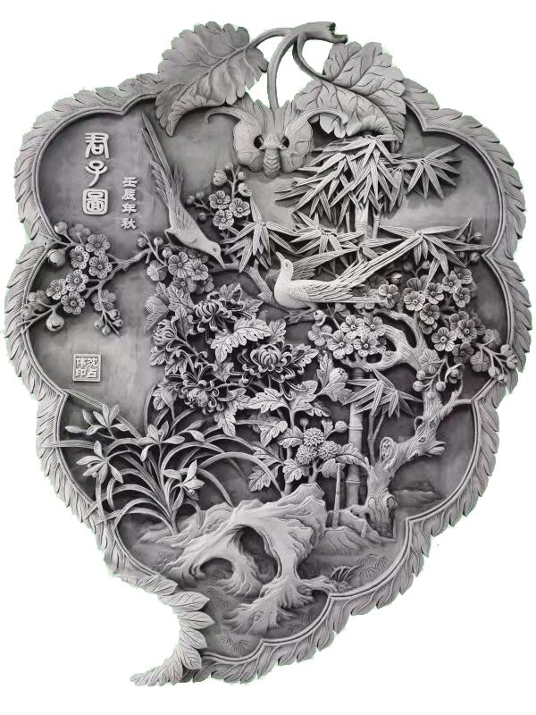 端詳沈占偉的作品,有栩栩如生的花鳥,大氣磅礴的山川,活靈活現(xiàn)的人物,能想到的體裁應(yīng)有盡有??梢哉f遠(yuǎn)看端莊大氣,近看細(xì)節(jié)精湛,尤其是對動植物的刻畫,仿佛通過他的刻刀賦予了生命,在原本冰冷的磚塊上呼之欲出,生機勃勃。難能可貴的是,他并不會限制自己的創(chuàng)作體裁,每一幅作品都是匠心之作,都傾盡了他的心血。