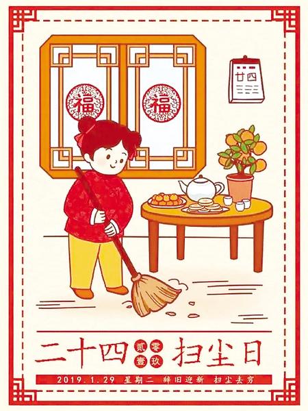 據(jù)《呂氏春秋》記載,這一風(fēng)俗源于堯舜時(shí)代。臘月二十四那天,隴上人家就陸續(xù)開(kāi)始打掃起來(lái),全家老少一起動(dòng)手,清掃房屋積塵,石灰刷墻,新紙裱糊仰塵,擦洗窗欞,糊上新窗紙,貼窗花或貼“窗孔子”(微型花鳥(niǎo)畫(huà)與書(shū)法),擦拭箱柜上的銅什件、器皿污垢,打氈抖土,拆洗被褥。一番流汗勞碌,居室煥然一新,過(guò)年的心情也更加舒暢。