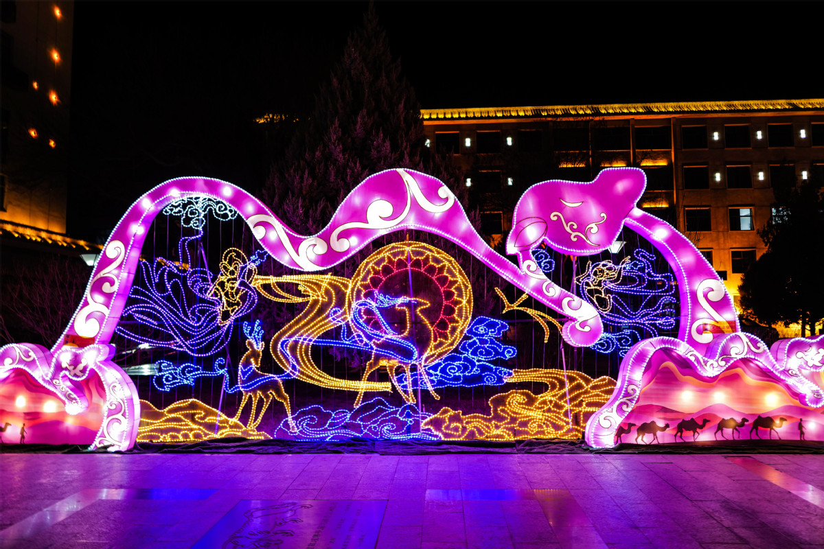 1月25日晚,甘肅省敦煌市“人類敦煌·心向往之”2022年新春文化燈展布置完成并亮燈,古郡敦煌大街小巷燈火輝煌,文化彩燈點(diǎn)亮古郡夜空。
