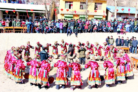 在岷縣,巴當(dāng)舞只在中寨鎮(zhèn)的古莊村、扎那村牙地社和一路村流傳,尤其古莊村最為鼎盛且具規(guī)模。這里毗鄰卓尼縣藏巴哇鎮(zhèn),藏漢兩地僅一公里之遙,情感相連,民心相通。長(zhǎng)期以來,群眾在經(jīng)濟(jì)、文化、婚姻等方面交流密切。時(shí)至今日,扎那、古莊等村群眾春節(jié)吃肉仍遺留著藏民族彪悍豪爽的風(fēng)格:一大盤“手把肉”端上來,上面插一把小刀,客人可以自削自啖,這種神秘的文化符號(hào)似乎無聲訴說著藏漢兩地的過往、發(fā)展和變遷……