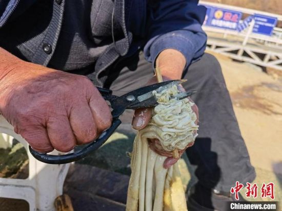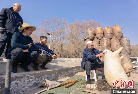 2月24日,春日暖陽下,今年70多歲的省級羊皮筏子非遺傳承人張德寶在蘭州黃河邊制作羊皮筏子,為迎接旅游旺季到來提前做好準備。劉玉桃 攝