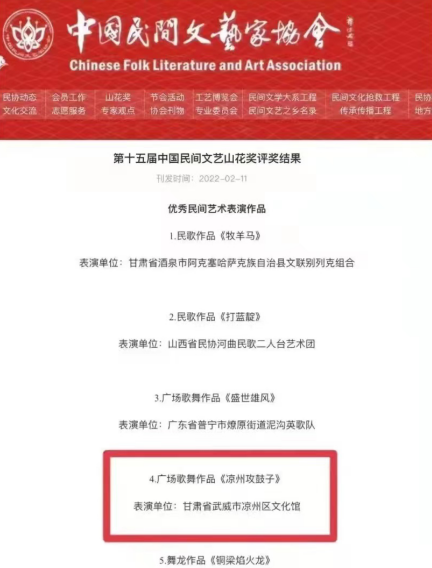 《涼州攻鼓子》榮獲第十五屆中國民間文藝山花獎