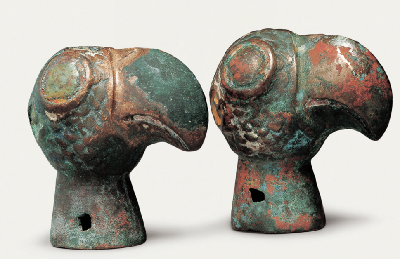 鷹是一些游牧民族崇拜的猛禽,十分威猛。青銅鷹首為軸桿類頂端的飾物,部族首領手執(zhí)桿頭有鷹首的器物以象征權威和神圣。