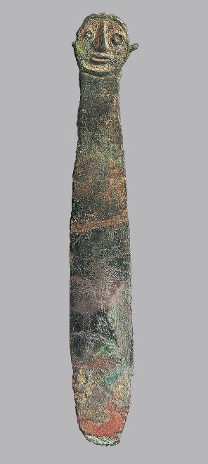 柄端鑄一人面像,圓睛,直鼻,口半張,匕身扁平,中略鼓,背有條形鈕。