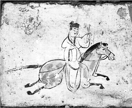 這一時期,自天子以至百官士庶,除乘車外還普遍騎馬。西晉時北方出現(xiàn)上馬時所踩的單馬鐙,南北朝后期又出現(xiàn)嚴格意義上的雙馬鐙。馬鐙的使用能減輕人們騎馬的體力消耗,有利于控制馬匹。這一時代的低級官員和百姓出行還乘驢、騾,甘肅等西北地區(qū)少數(shù)民族多乘駝,運載貨物主要用牛車。漢地民眾出行,仍然是安步當車。嘉峪關魏晉墓五號墓的《驛使圖》,畫面中一個郵驛使騎在馬上,頭戴進賢冠,身穿右襟寬袖衣,足蹬長靴,左手舉木牘文書,右手持馬韁,驛騎四蹄騰空,飛奔直前。這幅畫再現(xiàn)了當時甘肅地區(qū)驛使馳送文書的情景,也是我國古代郵驛使較早的形象資料。