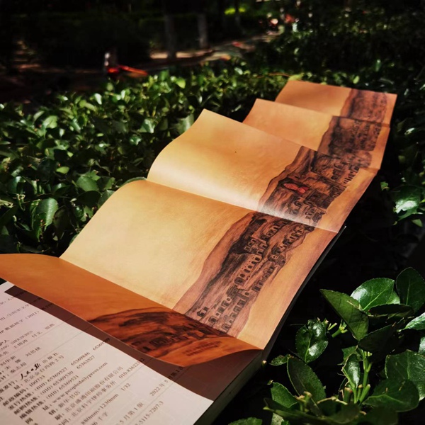 特別值得一提的是,曾作為敦煌“文化守望者”的90后插畫師陳夢(mèng)楚,依據(jù)歷史資料為該書手繪原長(zhǎng)達(dá)3.4米的全景圖,呈現(xiàn)莫高窟南區(qū)歷史圖景。這也是青年一代致敬莫高窟、致敬敦煌前輩的藝術(shù)表達(dá)。