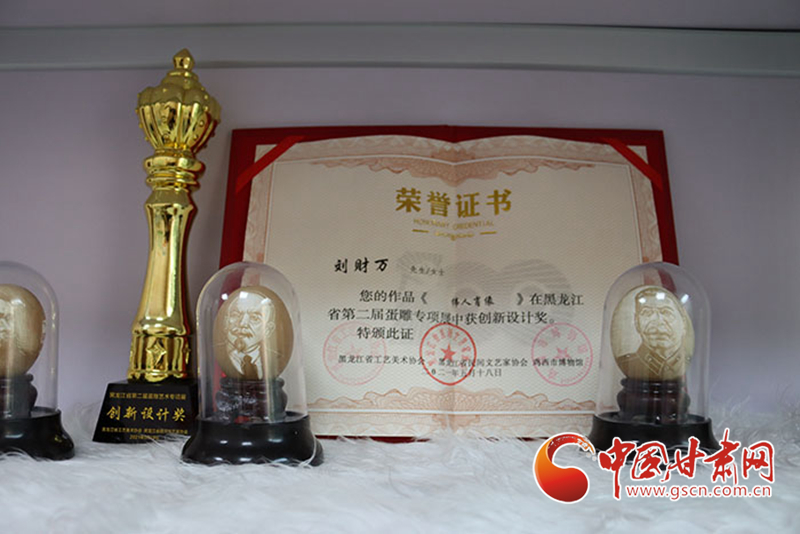 記者在采訪中注意到,社區(qū)的展柜一角擺放著不少獲獎證書,其中一張是在2021年的全國蛋雕專項(xiàng)展上,為劉財(cái)萬作品《偉人肖像》頒發(fā)的創(chuàng)新設(shè)計(jì)獎證書。“目前正在為全國蛋雕藝術(shù)聯(lián)展作準(zhǔn)備”,當(dāng)記者問起下一步打算時(shí),劉財(cái)萬顯得信心十足。