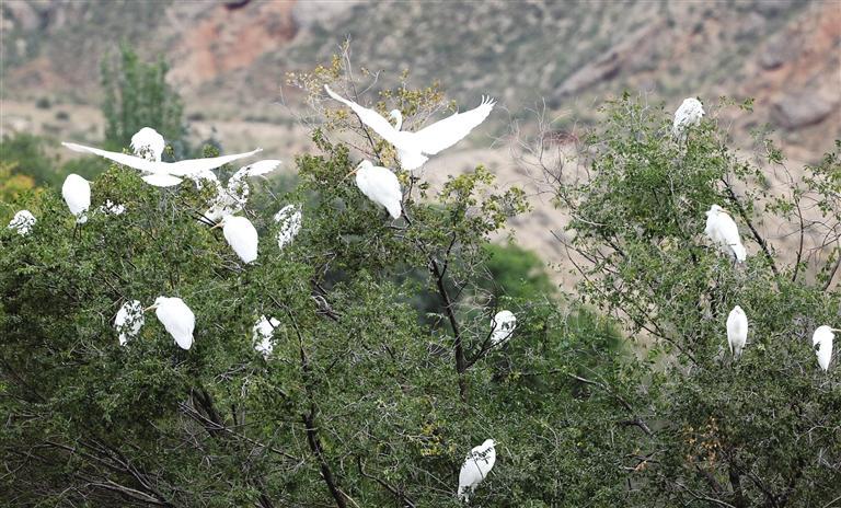 中國(guó)甘肅網(wǎng)10月14日訊 據(jù)蘭州日?qǐng)?bào)報(bào)道 金秋十月,蘭州新區(qū)秦王川國(guó)家濕地公園秋意漸濃。近日,隨著近百只白鷺的光臨,秦王川國(guó)家濕地公園再次迎來(lái)了候鳥(niǎo)遷徙的高峰期,成群的白鷺憩息在樹(shù)枝,繪就了一幅亮麗的秋景圖。