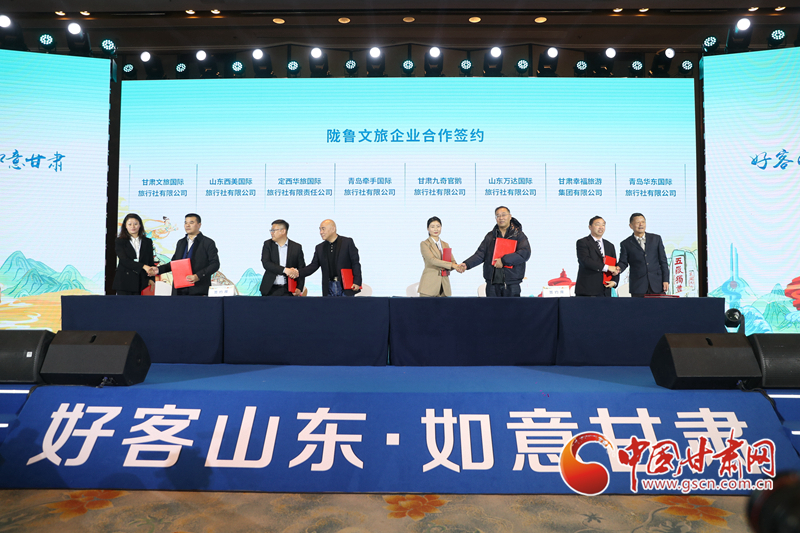 定西、隴南兩市文化廣電和旅游局分別與青島市文化和旅游局簽訂《戰(zhàn)略合作協(xié)議》,甘肅保利國(guó)際旅行社與青島好客五洲國(guó)際旅行社等兩地8家文旅企業(yè)(旅行社)代表分別簽訂了《“好客山東·如意甘肅”雙向游市場(chǎng)化客源互送合作協(xié)議》。