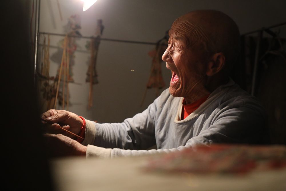 83歲的老藝人敬廷佑,操控著皮影,縱情表演。