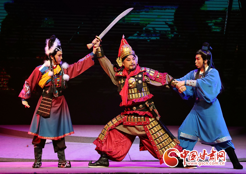 隴劇《敦煌》以回鶻族公主格麗莎的命運(yùn)軌跡為結(jié)構(gòu)框架和發(fā)展脈絡(luò),描繪了一幅炎黃子孫在血與火的洗禮中,保護(hù)中華民族文化的宏偉畫卷,充分詮釋了敦煌文化“美人之美”“美美與共”的開放胸襟,“止戈為武”“協(xié)和萬邦”的和平思想,“和為貴”“和而不同”的東方智慧以及“自強(qiáng)不息”的奮斗精神、“舍生取義”犧牲精神。