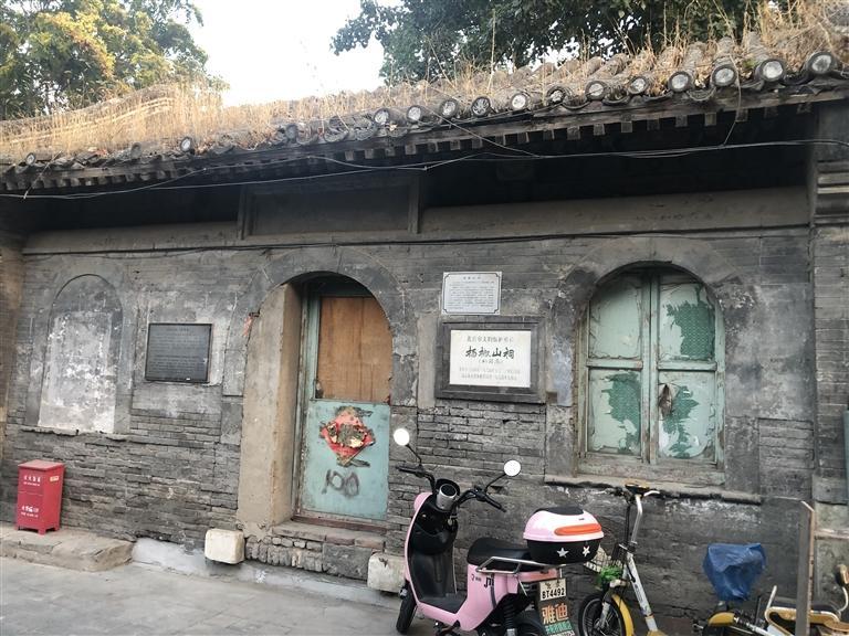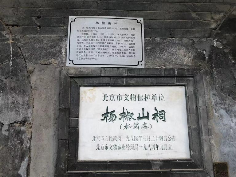 就是在這個(gè)胡同里,我看到一個(gè)歇山式屋頂?shù)姆课荩严喈?dāng)?shù)钠茢?,屋頂上長(zhǎng)滿(mǎn)了凄凄荒草,門(mén)窗皆已破爛不堪。但是門(mén)旁的墻壁上卻鑲嵌著一塊匾,近前一看,上面寫(xiě)著“楊椒山祠”。喲,這就是楊椒山在北京的祠。