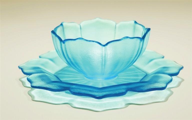 當(dāng)然,它的不凡更來自于它的創(chuàng)意源頭——甘肅省博物館展廳里那只造型華美、完整成套、顏色高貴的蓮花形玻璃托盞。
