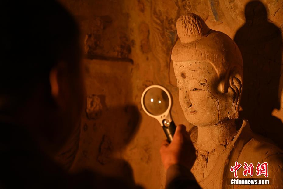 有時候看似簡單的佛像修復(fù)會遇到各類不同的文物病害,修復(fù)時間會長達三年之久,他也見證了文物修復(fù)技藝的變遷。隨著科技進步文物修復(fù)手段也變得越來越先進,他認(rèn)為未來的文物保護工作一定會越來越好,年輕文保工作者們也一定會想盡更多辦法留住這座世界文化遺產(chǎn)。圖為8月25日,文物修復(fù)師牟常有正在仔細觀察佛像表面出現(xiàn)的病害問題。李亞龍 攝