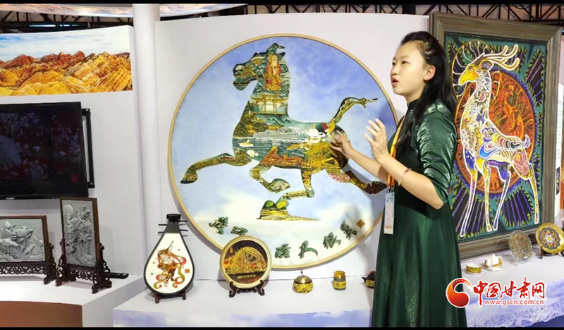 和阮琳的刻葫蘆一樣,由甘肅李明?,m瑯壁畫文化傳承發(fā)展有限公司展呈的“黃河之濱也很美”和靈動的九色鹿等充滿敦煌元素的掐絲琺瑯壁畫流光溢彩,精美絕倫,參觀問詢著絡(luò)繹不絕。