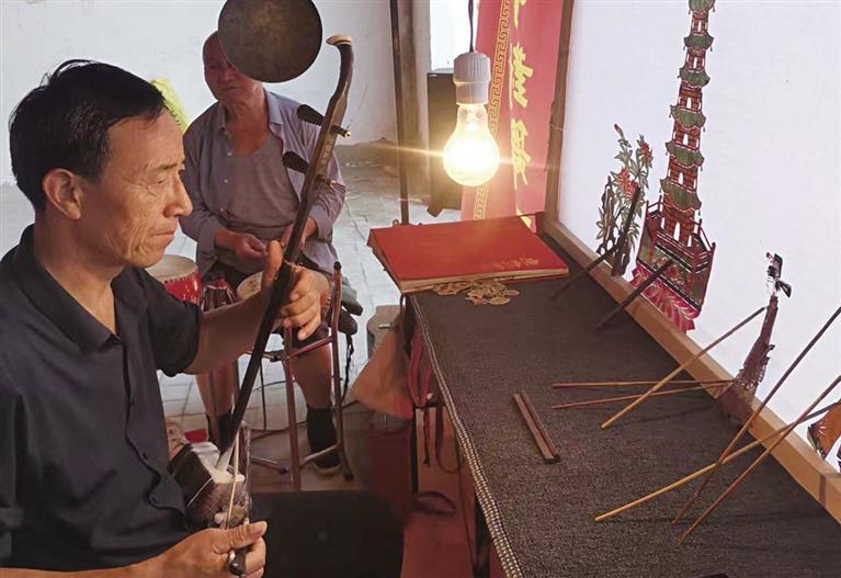 環(huán)縣道情皮影戲的價值主要體現(xiàn)在優(yōu)美獨特的道情音樂唱腔和精湛的皮影制作及表演上。戲班演出時,前臺一人挑扦表演,并承擔(dān)所有角色的坐唱念白,后臺四五人伴奏并“嘛簧”,一唱眾和,粗獷高亢,獨具風(fēng)格。伴奏樂器中的四弦、漁鼓、甩梆子、簡板均為自制,音色獨特,傳唱劇目有180余部,至今還保留著“圖”“卷”等古老文化符號。