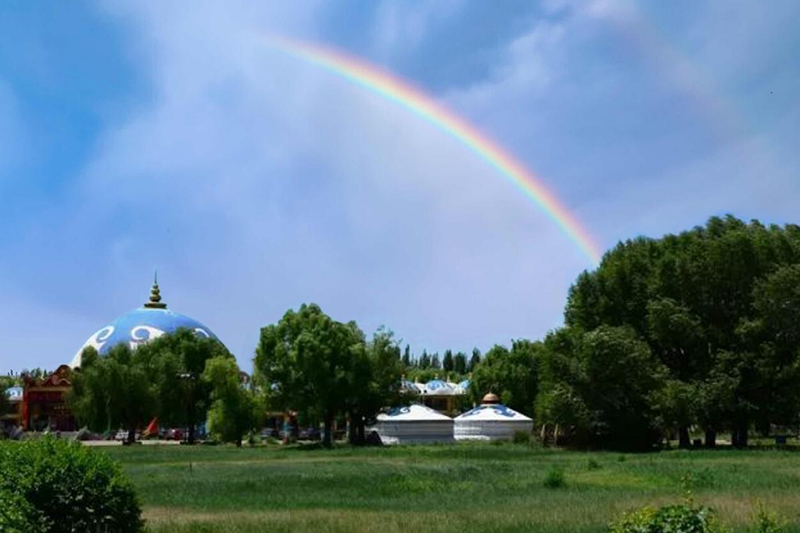 余每遙望心儀卻不能至的彩虹,常憶陸游《秋思》詩(shī)句:“天際掛虹初斷雨,云頭翳日又成陰。”秋游包頭賽汗塔拉(1),卻出人意料地邂逅可望亦可即的彩虹。經(jīng)當(dāng)?shù)赜讶艘I(lǐng)乘興疾步入彩虹落腳處,大異既往定見(jiàn),歸作以志其趣。