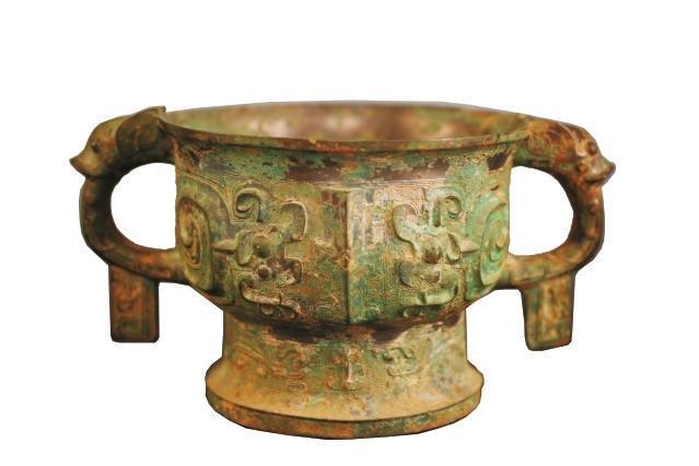 器物保存完整,紋飾十分講究,造型圖案十分精美,為國(guó)家一級(jí)文物。通高14.6厘米,口徑19厘米,底徑14.3厘米。鑄造工藝在西周時(shí)期屬于較為上乘之作。夔紋是圖騰紋飾,《說文》中云:“夔如龍而一足。”簋的兩邊為耳,呈環(huán)狀。上部各有一變形的龍首,顯得十分莊重、大氣。整個(gè)器物周身布滿綠銹,脫銹之處露出青銅光澤,透出歷史的厚重之美。