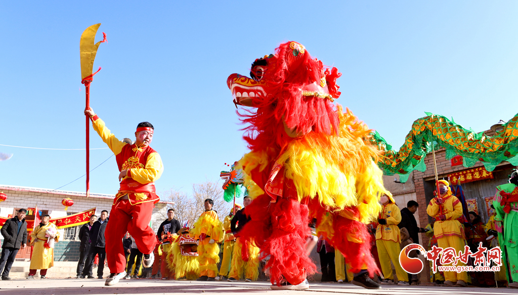 甘州區(qū)烏江鎮(zhèn)平原村“萬(wàn)家和美”社火隊(duì)隊(duì)員們走街串巷到村民家中拜大年。 通訊員 王將 攝