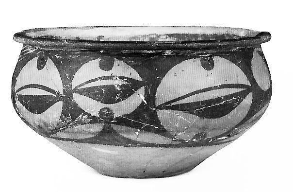 展廳陳列的寬帶紋缽、魚紋盆、彩陶葫蘆瓶主要是仰韶早期彩陶的代表作。其中魚紋圖案是仰韶文化的標(biāo)志性紋飾,從最初的寫實(shí)風(fēng)格演變到抽象化、簡(jiǎn)單化。陳列的幾件魚紋盆清晰地顯示了這個(gè)變化過(guò)程。中期彩陶構(gòu)圖以弧線為主,線條流暢柔美,圖案華麗精巧。常見(jiàn)紋飾有弧形三角紋、迴旋勾連紋、花瓣紋等,表現(xiàn)出大自然生機(jī)勃勃、欣欣向榮的景象。展出的典型器有三角紋彩陶缽、網(wǎng)格紋彩陶盆、勾葉紋彩陶盆等。晚期彩陶數(shù)量雖呈下降趨勢(shì),但工藝卻比中期更為成熟,大型彩陶器以及內(nèi)壁繪彩的制作方法開(kāi)始出現(xiàn)。常見(jiàn)的紋飾有弧邊三角形、圓點(diǎn)圓圈紋、漩渦紋、網(wǎng)格紋等,還有個(gè)別蛙紋、犬紋。鋸齒紋彩陶壺、花瓣紋彩陶盆、弧三角網(wǎng)格紋盆均為這個(gè)時(shí)期的精品佳作。該時(shí)期流行的一些彩陶元素如內(nèi)彩、鋸齒紋、平行線紋、漩渦紋等被后世的馬家窯文化吸收繼承并發(fā)揚(yáng)光大。