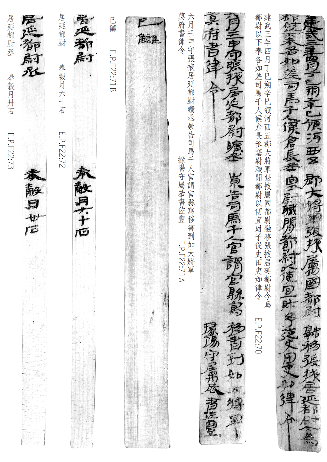 1974年8月出土于甲渠候官遺址第22號(hào)房址內(nèi)。簡(jiǎn)冊(cè)由10枚簡(jiǎn)組成,每簡(jiǎn)長22.8厘米,前兩簡(jiǎn)寬2.5厘米,其余8簡(jiǎn)寬1.4厘米。全文200字。內(nèi)容為東漢建武三年(公元25年)竇融統(tǒng)治河西期間留下的一份完整的財(cái)政文書。簡(jiǎn)文是關(guān)于居延都尉府吏員奉谷標(biāo)準(zhǔn)的通知,由領(lǐng)河西五郡大將軍張掖屬國都尉竇融幕府下發(fā),簡(jiǎn)言“如律令”可知其指令具有法律效力。
