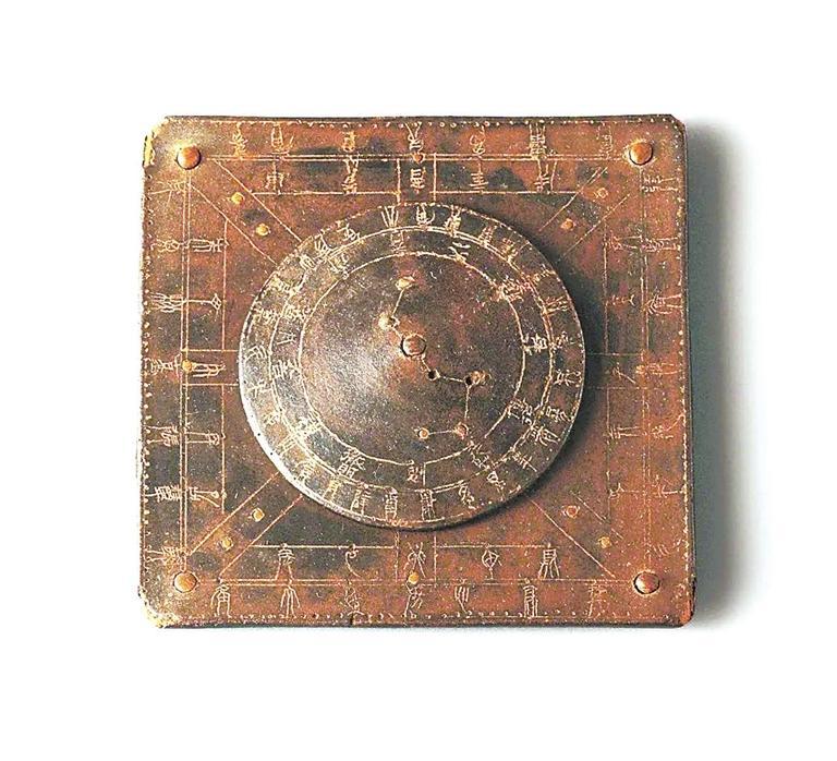 1972年武威市磨嘴子漢墓出土的這件漆栻盤,直徑6厘米,厚1厘米,地盤邊長(zhǎng)9厘米,木胎,髹深褐色漆。由圓形的天盤和方形的地盤構(gòu)制而成,天盤位于地盤之上,正中心以竹軸貫聯(lián),使天盤可以轉(zhuǎn)動(dòng)。天盤中陰刻兩個(gè)同心圓,將其分為三區(qū):內(nèi)區(qū)以竹珠鑲嵌北斗七星,星間刻線相連,斗柄中節(jié)穿過(guò)圓心。中區(qū)內(nèi)隸書(shū)陰刻十二月神,外區(qū)陰刻篆書(shū)二十八宿名。地盤以兩個(gè)相套的正方形分為三區(qū):內(nèi)區(qū)納天盤,中區(qū)陰刻篆書(shū)十天干中的八干(不刻戊己)和十二地支名,外區(qū)陰刻篆書(shū)二十八宿名。