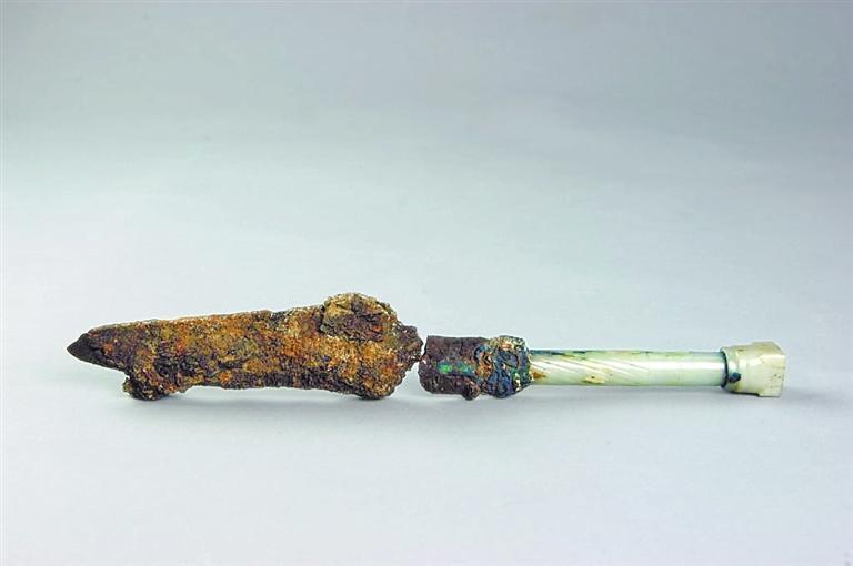 玉柄鐵劍出土于河南三門峽虢國(guó)國(guó)君虢季的墓葬,全長(zhǎng)34.2厘米,其中劍柄長(zhǎng)12.2厘米,劍身長(zhǎng)22厘米。劍柄為銅芯,起到連接劍柄和劍身的作用,銅芯外鑲有晶瑩透亮的和田美玉和綠松石,并有精美的竹節(jié)飾紋,劍身和劍柄的結(jié)合處也鑲有綠松石。劍身經(jīng)由北京科技大學(xué)冶金與材料史研究所鑒定,是由塊煉法鍛制而成,劍身外有絲織品包裹的痕跡,應(yīng)當(dāng)是被絲織品包裹后放入劍鞘。劍鞘則由牛皮精制而成。這把玉柄鐵劍不僅制作精美,而且其利用玉、銅、鐵三種材料制作而成,是我國(guó)目前考古發(fā)掘出土的年代最早的人工冶鐵制品。它將我國(guó)的人工冶鐵歷史推前了近兩個(gè)世紀(jì),被專家們譽(yù)為“中華第一劍”。