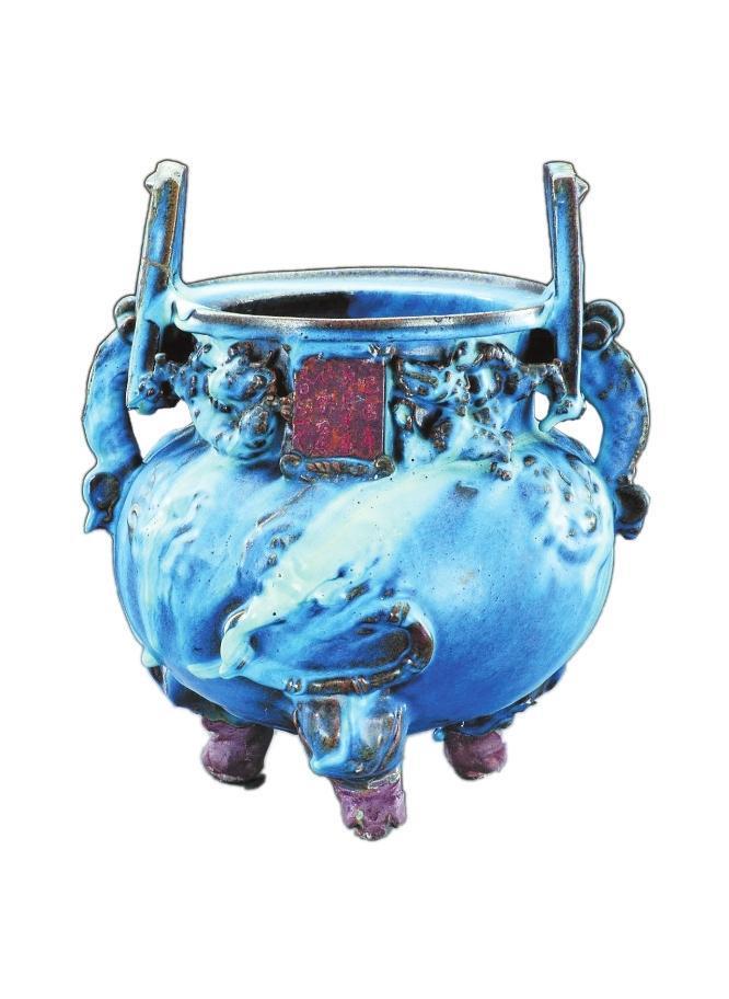 香爐整體造型為雙立耳,圓鼓腹,三獸足,體形較大。頸部雕貼三只麒麟,正面有一初方形題記,刻有“己酉年九月十五小宋自造香爐一個(gè)”共計(jì)15字,經(jīng)考證:“己酉年”是公元1309年,屬于元代中期。香爐通體施天青色釉,釉層較厚,在高溫中由于積釉濃淡不一,縱橫流淌到器表各處,形成天青、天藍(lán)、灰藍(lán)等不同釉面,再與紅褐色的露胎對(duì)比,有了銅器般的金屬質(zhì)感。