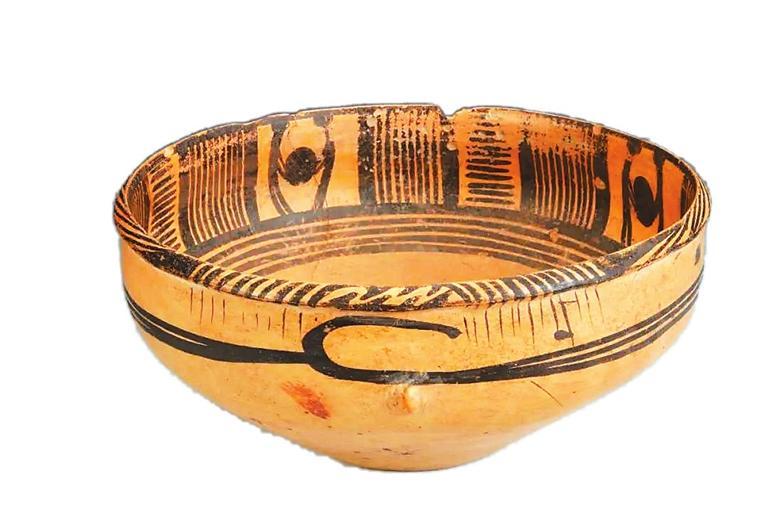 這件距今5000多年的古代彩陶作品,制作精致,圖案精美,人物形體鮮明,造型和動(dòng)作既抽象又生動(dòng)。彩陶盆通高11.3厘米,口徑24.5厘米,底徑9.8厘米,細(xì)泥制作,唇外侈,略鼓腹,腹部?jī)蓚?cè)有對(duì)稱的小鈕??谘貎?nèi)壁為四組雙人抬物圖案,中間以橫豎線條組成的幾何圖案間隔,形成一周四方連續(xù)的紋飾帶,繪制于陶盆內(nèi)側(cè)上部,二人的頭部以圓點(diǎn)代表,軀干和四肢以線條描繪。兩人相向站立,共同抬起一個(gè)碩大的圓形物體,畫(huà)面簡(jiǎn)潔而生動(dòng),寥寥數(shù)筆就將人抬重物時(shí)雙腿開(kāi)立、腰背微屈用力的形態(tài)刻畫(huà)得惟妙惟肖。陶盆上精妙的紋飾讓它成為我國(guó)最早在彩陶上表現(xiàn)原始先民勞作場(chǎng)景的藝術(shù)珍品。