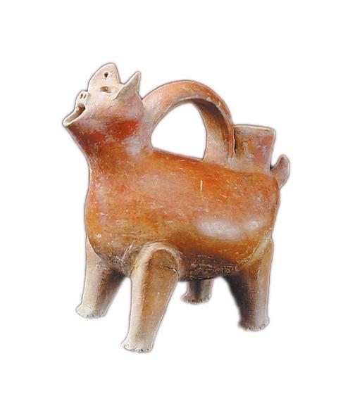 紅陶獸形壺,高21.6厘米,夾砂紅陶,通體磨光,遍施紅色陶衣,光潤(rùn)亮澤。器型圓面聳耳,拱鼻,張口,耳穿小孔,四肢粗壯,短尾上翹,背裝弧形提手,尾根部一筒形注水口,嘴可往外倒水,腹部鼓起加大了容積,四足立起可供加熱,使用方便,造型生動(dòng)美觀,集實(shí)用與仿生藝術(shù)于一身,是大汶口文化獨(dú)有的器形,充滿了創(chuàng)造性的靈感,是新石器時(shí)代一件難得的陶器珍品。
