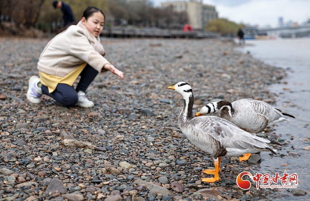 3月24日,在甘肅省蘭州市城關(guān)區(qū)黃河河畔,市民正在給斑頭雁投食、拍照。