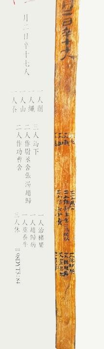 簡8是某月2日,17名戍卒勞作記錄。削同削工。繩,搓麻繩。一人山,缺當(dāng)時語言環(huán)境,不可釋。養(yǎng),烹煮,做飯。三人馬下,同簡7中的“一人馬下”。尉丞、功曹是都尉府中下級軍官職稱。尉丞舍、功曹舍,舍,宿舍,4名戍卒分別維修、加固尉丞和功曹的宿舍。橥,是拴牲口的木樁,治豬橥,即用木樁圍豬欄,說明玉門都尉府養(yǎng)豬。莝,鍘草,莝養(yǎng)牛,即鍘草養(yǎng)牛,說明玉門都尉府養(yǎng)牛。