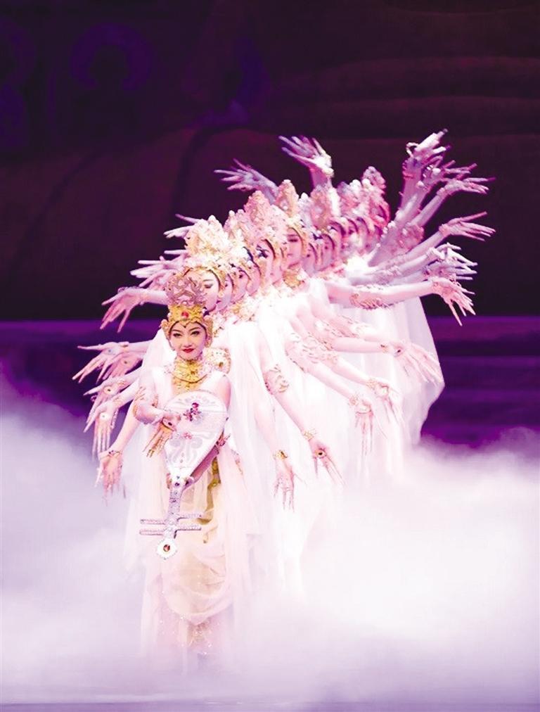 經(jīng)典舞劇《絲路花雨》歷經(jīng)45載,累計演出3952場,觀眾達537.47余萬人次,享有“中國民族舞劇的典范”“東方的《天鵝湖》”之稱。演出現(xiàn)場,劇中經(jīng)典舞蹈選段《金光千佛》《反彈琵琶》《霓裳羽衣舞》《夢幻伎樂天》為游客粉絲和廣大觀眾繽紛綻放,引發(fā)陣陣歡呼。“反彈琵琶”源自莫高窟第112窟的反彈琵琶樂舞圖,“千手觀音”還原了莫高窟元代3窟中的千手千眼觀音圖,“活著的敦煌壁畫”、獨創(chuàng)的“S”形舞姿讓游客沉浸式感受絲路文化藝術的魅力。