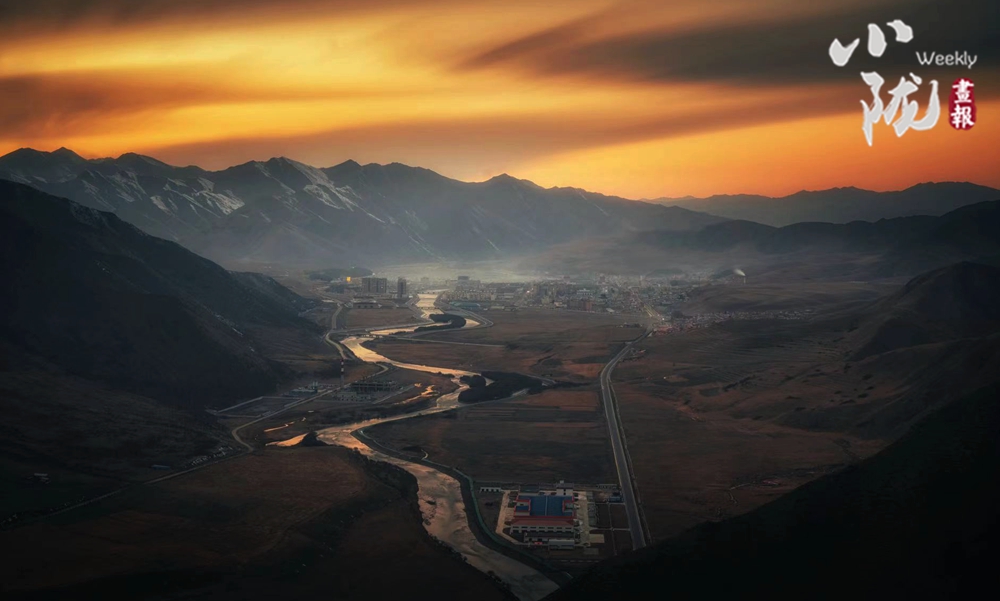 遠(yuǎn)處連綿的群山白雪皚皚,山下青黃的草甸、安靜的藏式小村、飄蕩的經(jīng)幡、裊裊炊煙,勾勒出一幅美麗的畫。