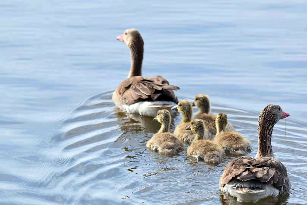 灰雁是鴨科雁屬鳥類,屬國家重點保護的“三有”鳥類,也是陽關(guān)濕地的夏候鳥。監(jiān)測顯示,在陽關(guān)濕地繁殖的灰雁家族有100多只。每年3月下旬遷飛至陽關(guān)濕地,4月中旬筑巢繁殖,5月上旬孵化出雛鳥4至5只?;已銥?ldquo;一夫一妻”制,孵化由雌鳥單獨承擔(dān),雄鳥在巢附近負責(zé)警戒。待雛鳥破殼出窩后,則由雌雄共同撫育?;已闵阅懶 C警,小寶寶溜達時,雌鳥在前開道,雄鳥負責(zé)斷后,小寶寶上岸覓食嫩草芽時,雄鳥仍然負責(zé)警戒,若有危險立刻鳴叫警示。故而,近距離拍攝灰雁雛鳥是比較困難的。