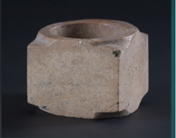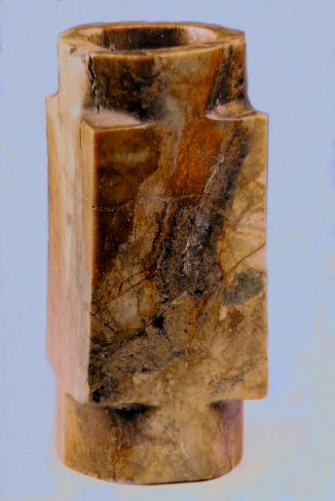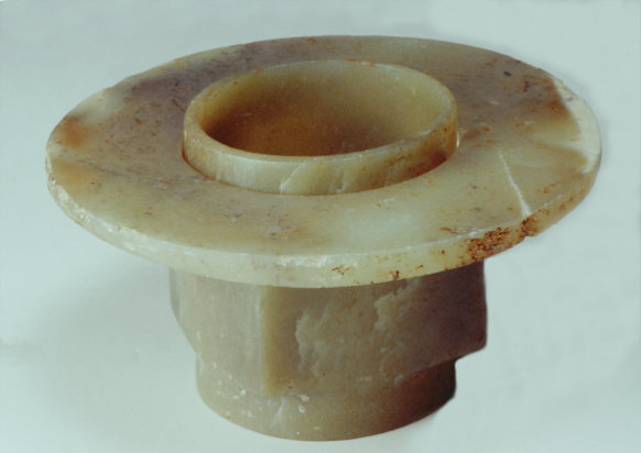 玉琮(編號(hào)總0128:1)高4~4.2厘米,外方邊長6.1~6.3厘米,內(nèi)徑5.2厘米,上端射較長,下端射極短,形制原始古樸,切割改制的現(xiàn)象明顯。