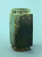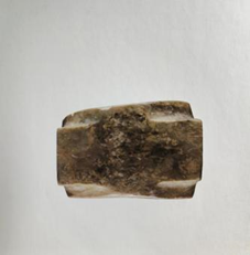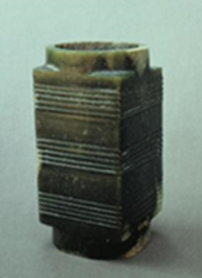 玉琮(編號(hào)總0128:2)高4.6~5.2厘米,外方邊長5.5~5.7厘米,內(nèi)徑大端5.4厘米,小端4.2厘米,形制一端較規(guī)整,另一端四角上部不規(guī)整。