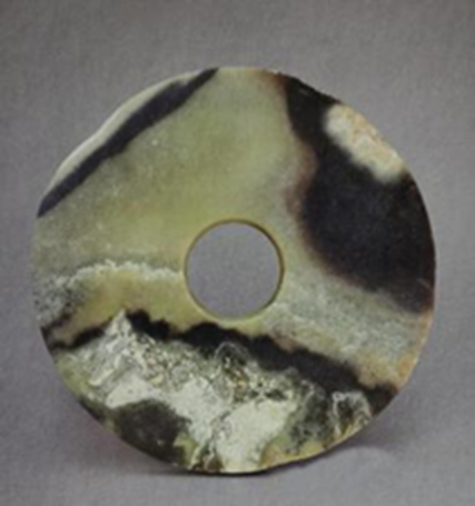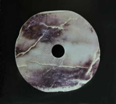 玉璧(編號(hào)總0129:4)直經(jīng)13.8厘米,單面鉆孔,大端孔徑5.2厘米,小端孔徑4.8厘米,璧面厚度不均勻,0.4~0.65厘米。