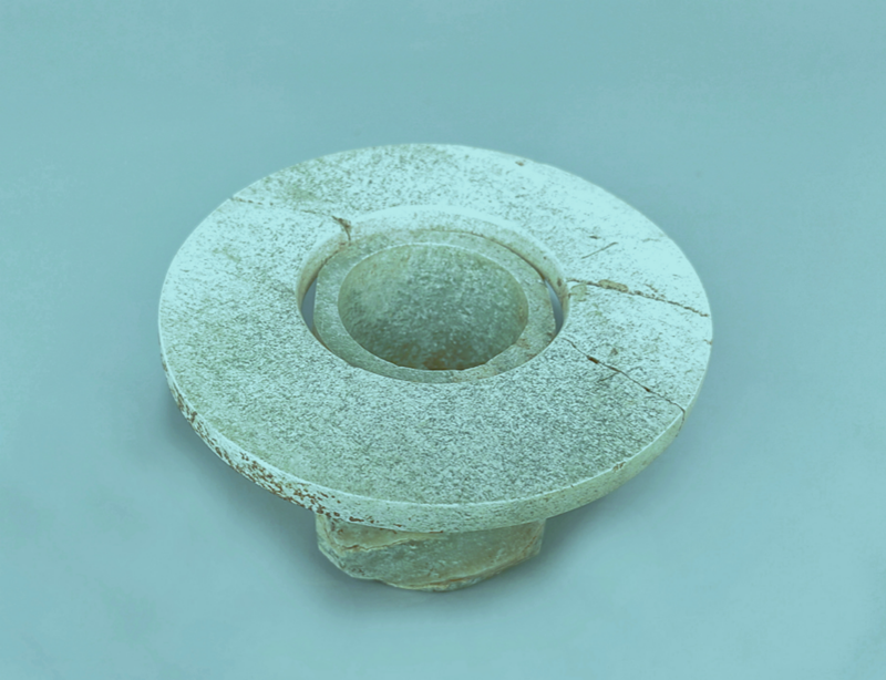 玉璧(編號(hào)總0129:5)直經(jīng)9厘米,單面鉆孔,大端孔徑4.4厘米,小端孔徑4厘米,厚度0.55—0.7厘米,璧外緣有磕碰痕。