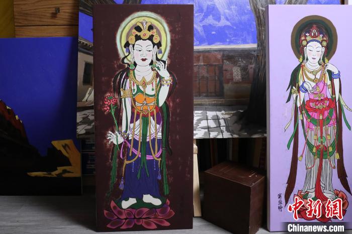 北京外國(guó)語(yǔ)大學(xué)藝術(shù)研究院院長(zhǎng)寧強(qiáng)以敦煌莫高窟壁畫為靈感創(chuàng)作的繪畫作品。 徐雪瑩 攝
