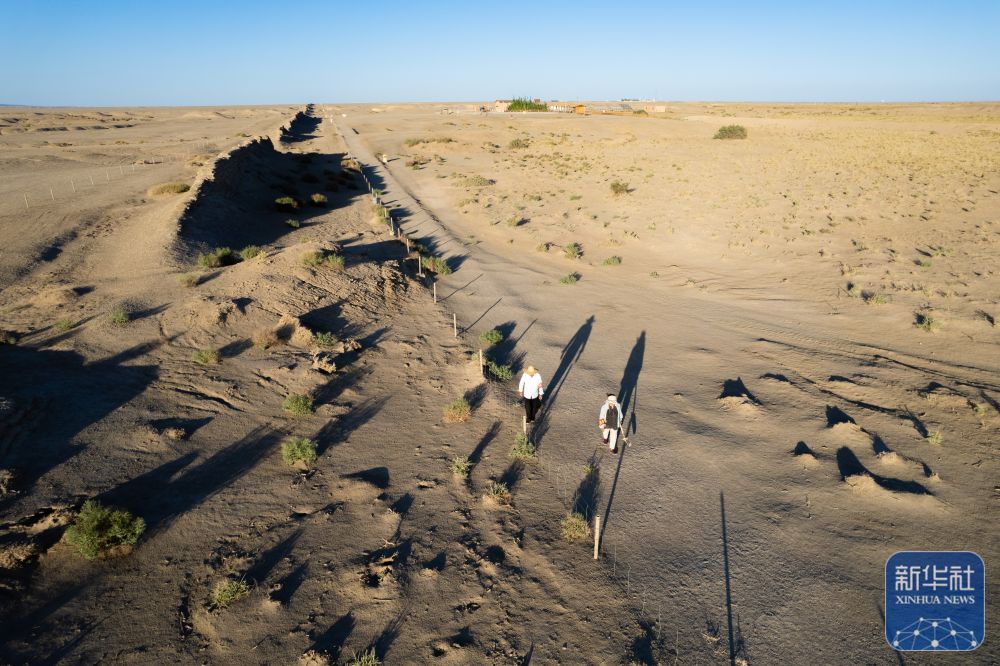 ↑這是張吉全和聞春瑜夫婦負(fù)責(zé)巡護(hù)的一段漢長(zhǎng)城遺址(7月16日攝,無人機(jī)照片)。
