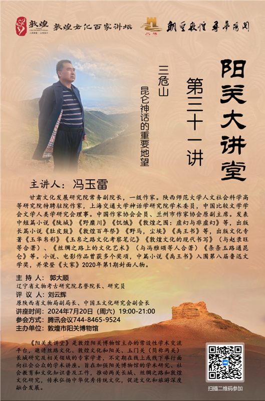 中國甘肅網(wǎng)7月18日訊 7月20日,西北師范大學(xué)甘肅文化發(fā)展研究院常務(wù)副院長、一級作家、玉文化學(xué)者馮玉雷將在線進(jìn)行題為《三危山:昆侖神話的重要地望》的講座。本次講座由敦煌陽關(guān)博物館主辦,為“敦煌文化百家講壇”第31講,遼寧省文物考古研究院名譽(yù)院長、資深考古學(xué)家、玉學(xué)家郭大順研究員擔(dān)綱主持,陜西省文物局原副局長、中國玉文化研究會副會長、資深玉學(xué)家劉云輝教授擔(dān)綱評議。